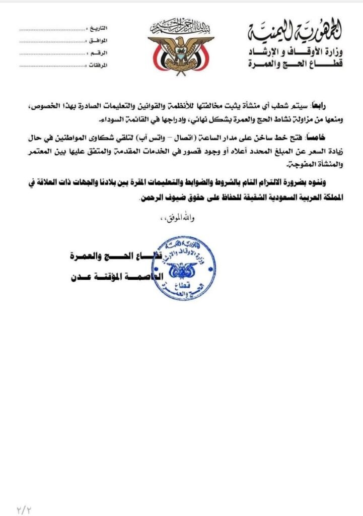 وألزم التعميم جميع منشآت العمرة ببيع البرنامج الاقتصادي بسعر لا يتجاوز (800) ريال سعودي، مع فرض ضوابط صارمة للشفافية تشمل الإعلان عن الأسعار عبر المنصات الرسمية للبرامج الأخرى، إلى جانب إجراءات رقابية مشددة بحق المنشآت المخالفة تصل إلى الشطب ومنع مزاولة النشاط.