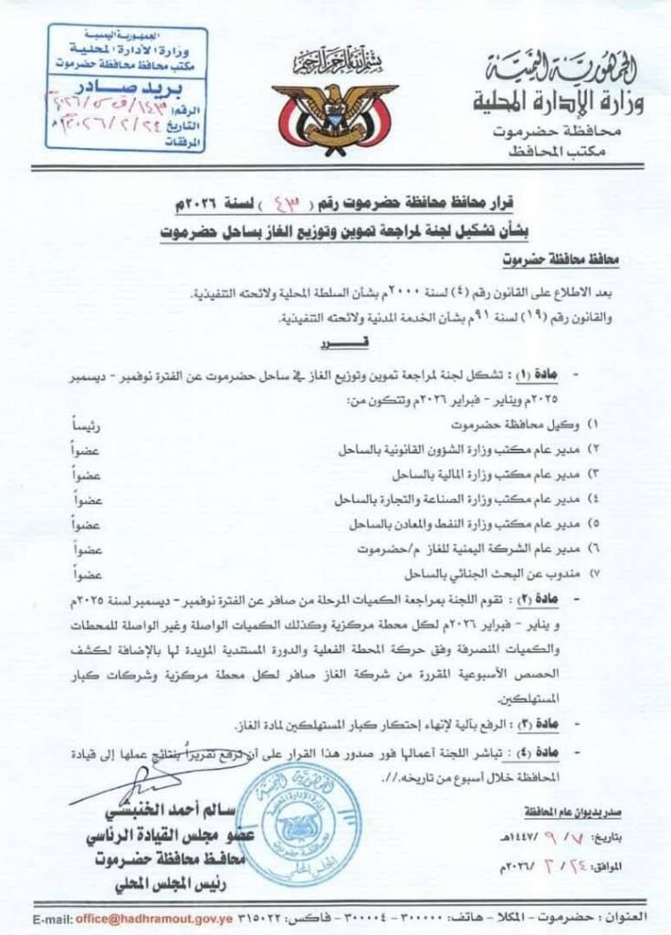 أصدر عضو مجلس القيادة الرئاسي محافظ حضرموت الاستاذ سالم احمد الخنبشي، اليوم، القرار رقم (43) لسنة 2026م بشأن تشكيل لجنة المراجعة تموين وتوزيع الغاز بساحل حضرموت، عقب الاطلاع على القانون رقم (4) لسنة 2000م بشأن السلطة المحلية ولائحته التنفيذية والقانون رقم (19) لسنة 91م بشأن الخدمة المدنية ولائحته التنفيذية، ونص القرار على التالي: