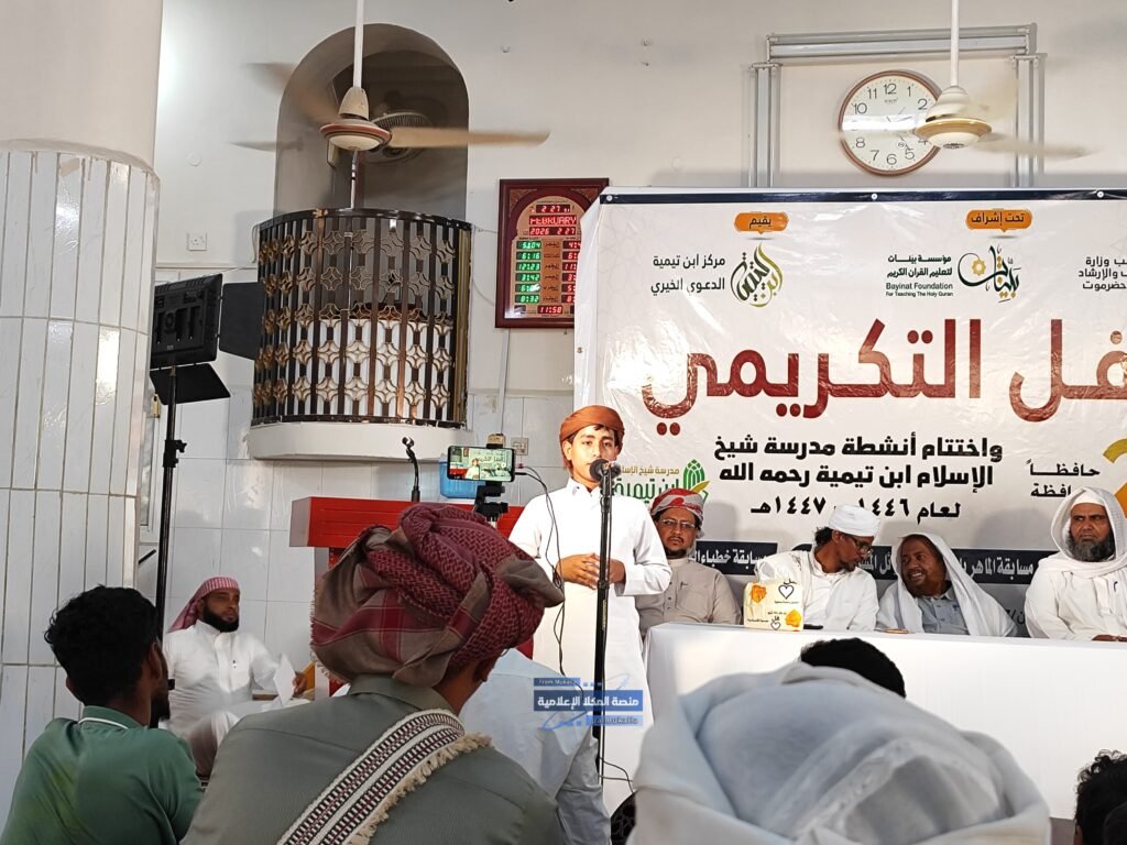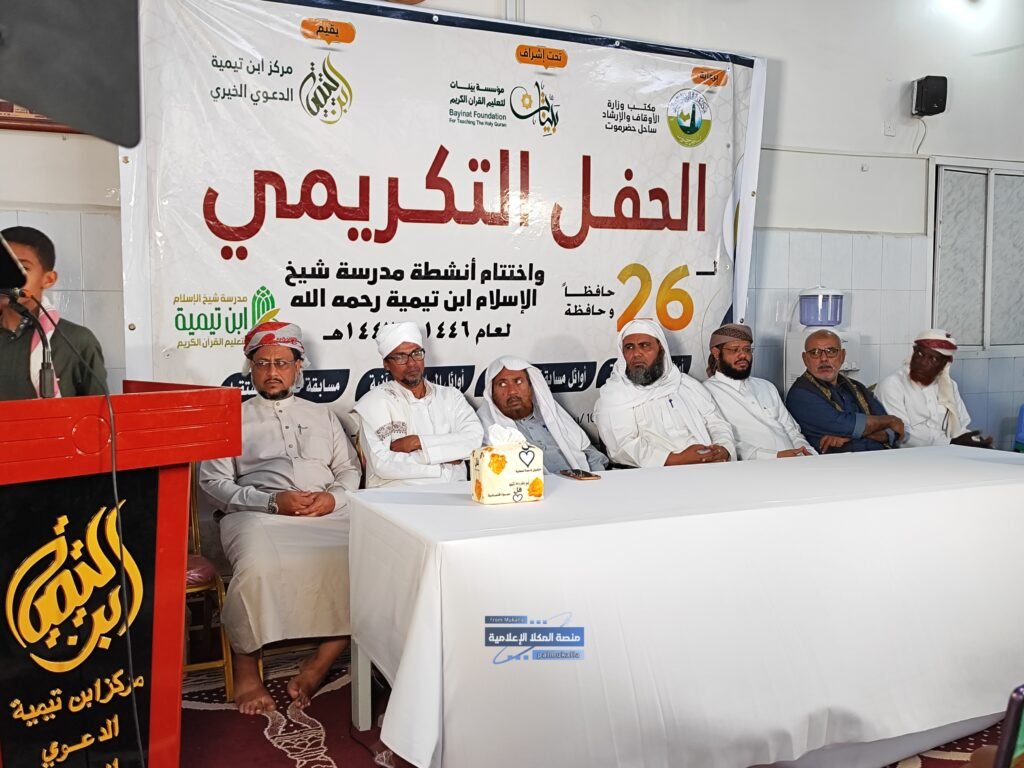 شهد مسجد شيخ الإسلام ابن تيمية، بديس المكلا، إقامة الحفل التكريمي لتكريم (26) حافظًا وحافظةً لكتاب الله تعالى