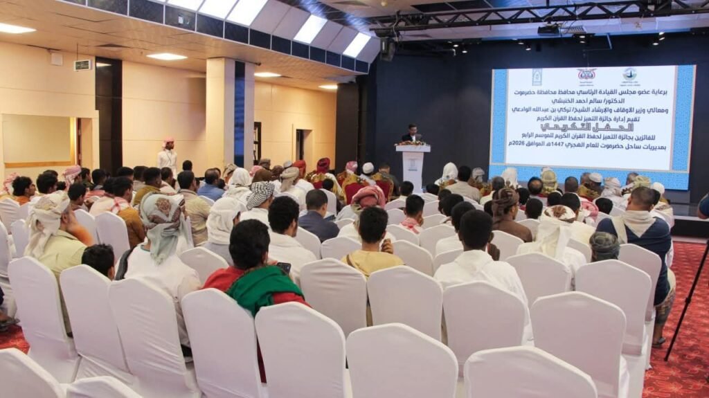 شهد وكيل محافظة حضرموت الأستاذ حسن سالم الجيلاني، مساء اليوم بمدينة المكلا، الحفل التكريمي لجائزة التميز لحفظ القرآن الكريم في موسمها الرابع للعام 1447هـ الموافق 2026م، بحضور عضو مجلس الشورى الأستاذ محمد عبدالله الحامد، وعددٍ من مديري عموم المكاتب التنفيذية، والشخصيات الاجتماعية