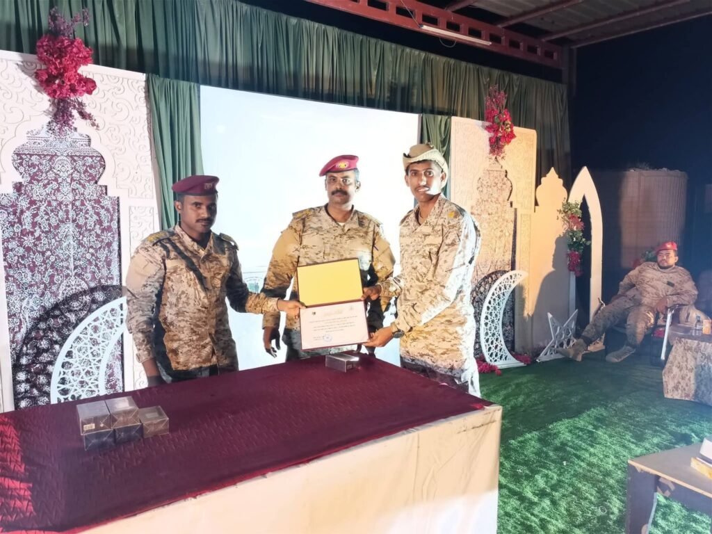 وفي الجانب التوعوي والإيماني، تضمنت الأمسية فقرة دينية قدمها الداعية الملازم محمد صالح العطاس والجندي سلطان مطيع باطرفي، تحدثا خلالها عن القيم الإيمانية التي يعززها شهر رمضان، وأثرها في ترسيخ الصبر والثبات ورفع المعنويات لدى المقاتلين، مؤكدين أن قوة المقاتل لا تكتمل إلا بالإيمان والوعي الفكري إلى جانب التأهيل العسكري.