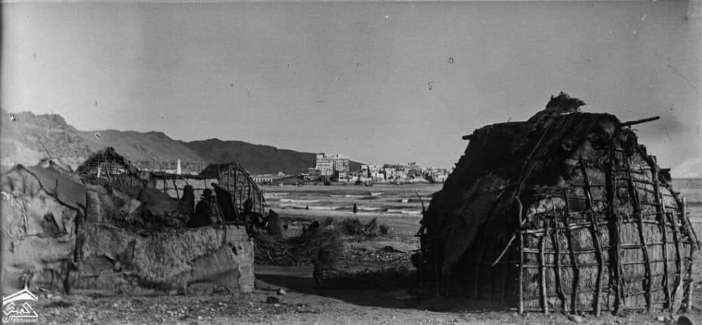 هكذا بدت المكلا في أواخر القرن التاسع عشر كما تُرى من ساحلها، حيث تنتصب البيوت الأولى بمحاذاة قصر النقيب الكسادي في حيّ البلاد تلك البقعة التي شكّلت نواة المدينة وبدايات عمرانها، قبل أن تمتد لاحقآ إلى حارات متلاصقة نسجت ملامح المكلا القديمة. وتلتقط الصورة مشهدآ عفويآ لحارة البلاد من بين العروش المشيّدة من جدوع الأشجار وسعف النخيل، والمسقوفة بسلق الخوص، التي وفّرت حماية من وهج الشمس وتقلبات الساحل، ويظهر بعض ساكنيها وربما كانوا يجمعون الحطب الذي شكّل آنذاك وقود الطهي والإنارة ووسيلة الدفء الرئيسي.