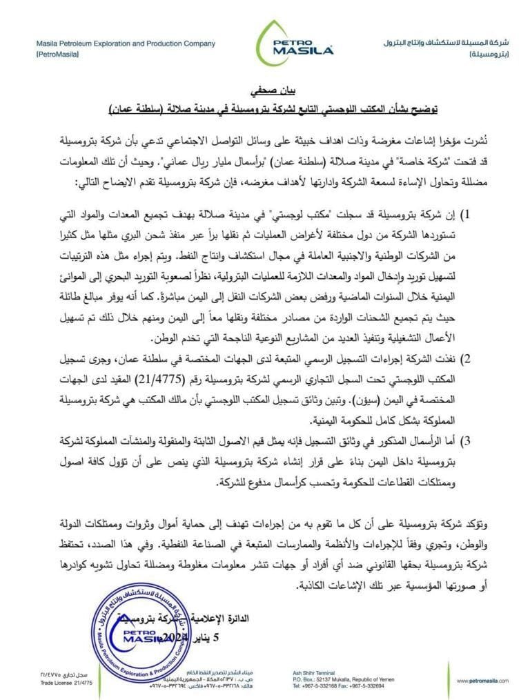 تلقت `منصة المكلا` بيان توضيح بشأن المكتب اللوجستي التابع لشركة بترومسيلة في مدينة صلالة (سلطنة عمان).