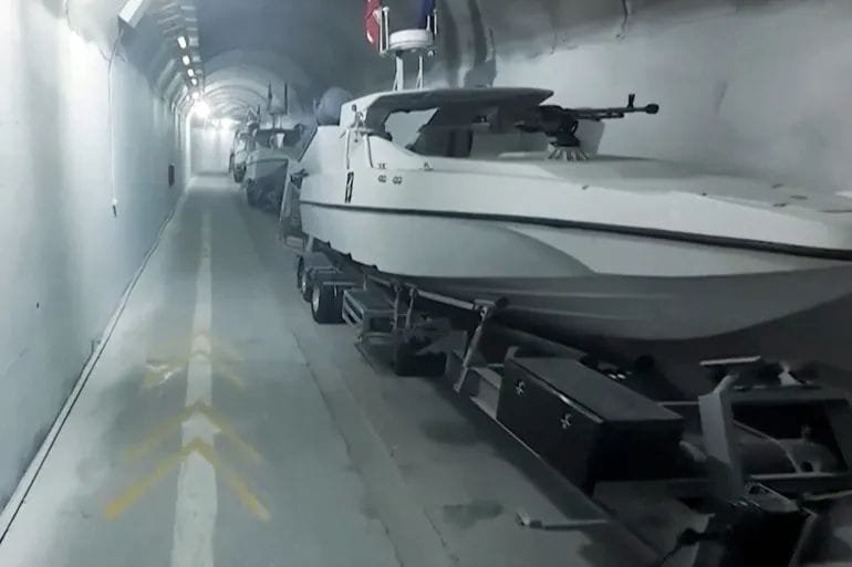 وأظهرت اللقطات عشرات السفن الصغيرة المجهزة برشاشات وصواريخ في أنفاق المنشأة تحت الأرض.