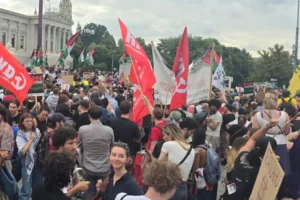 من جهته، قال توبك أحد المشاركين باسم “حركة التضامن مع فلسطين “ومجموعات طلابية أخرى أنا “هنا لإيصال رسالتنا حرروا فلسطين، حرروا غزة، يسقط جيش الاحتلال الإسرائيلي“.