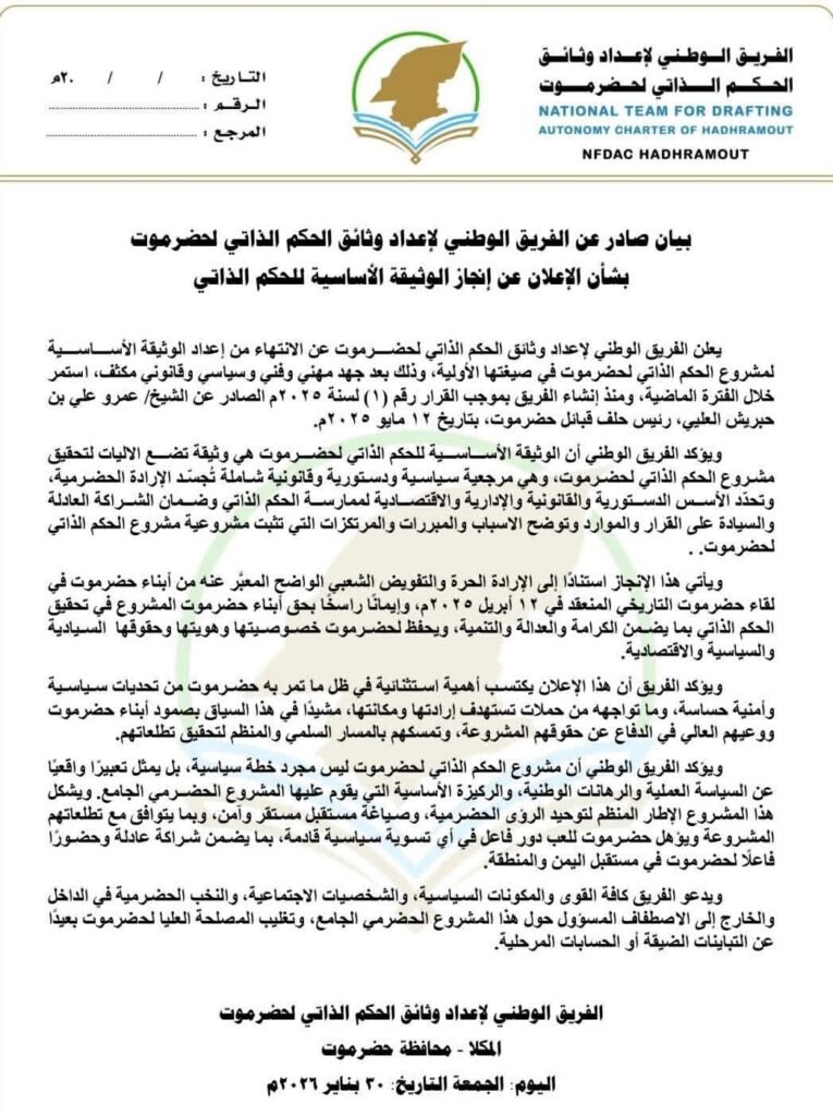 يعلن الفريق الوطني لإعداد وثائق الحكم الذاتي لحضرموت عن الانتهاء من إعداد الوثيقة الأساسية لمشروع الحكم الذاتي لحضرموت في صيغتها الأولية، وذلك بعد جهد مهني وفني وسياسي وقانوني مكثف، استمر خلال الفترة الماضية، ومنذ إنشاء الفريق بموجب القرار رقم (1) لسنة 2025م الصادر عن الشيخ/ عمرو علي بن حبريش العليي، رئيس حلف قبائل حضرموت، بتاريخ 12 مايو 2025م.