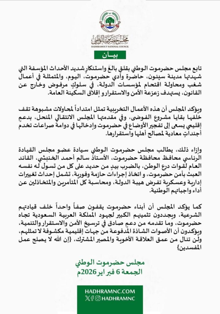 تابع مجلس حضرموت الوطني بقلقٍ بالغ واستنكارٍ شديد الأحداث المؤسفة التي شهدتها مدينة سيئون، حاضرة وادي حضرموت، اليوم، والمتمثلة في أعمال شغب ومحاولة اقتحام لمؤسسات الدولة، في سلوكٍ مرفوض وخارج عن القانون، يستهدف زعزعة الأمن والاستقرار وإقلاق السكينة العامة.