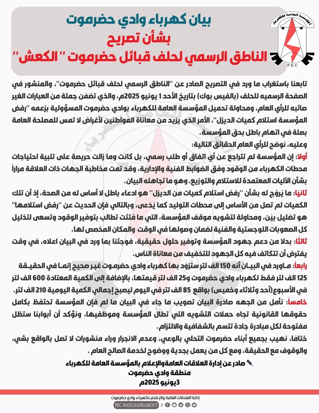 بيان كهرباء وادي حضرموت بشأن تصريح الناطق الرسمي لحلف قبائل حضرموت ” الكعش
