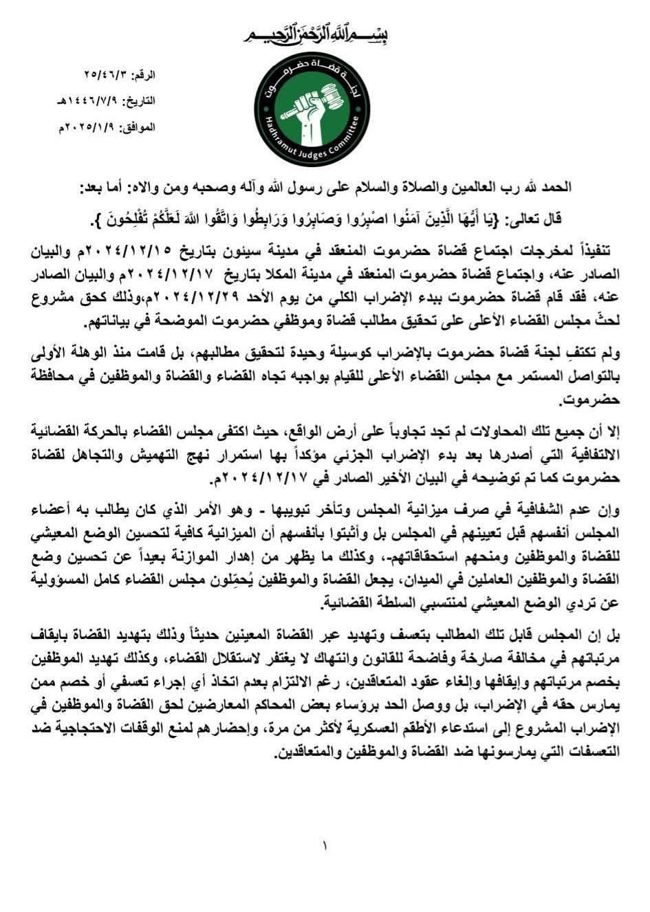 بيان هام صادر عن لجنة قضاة حضرموت